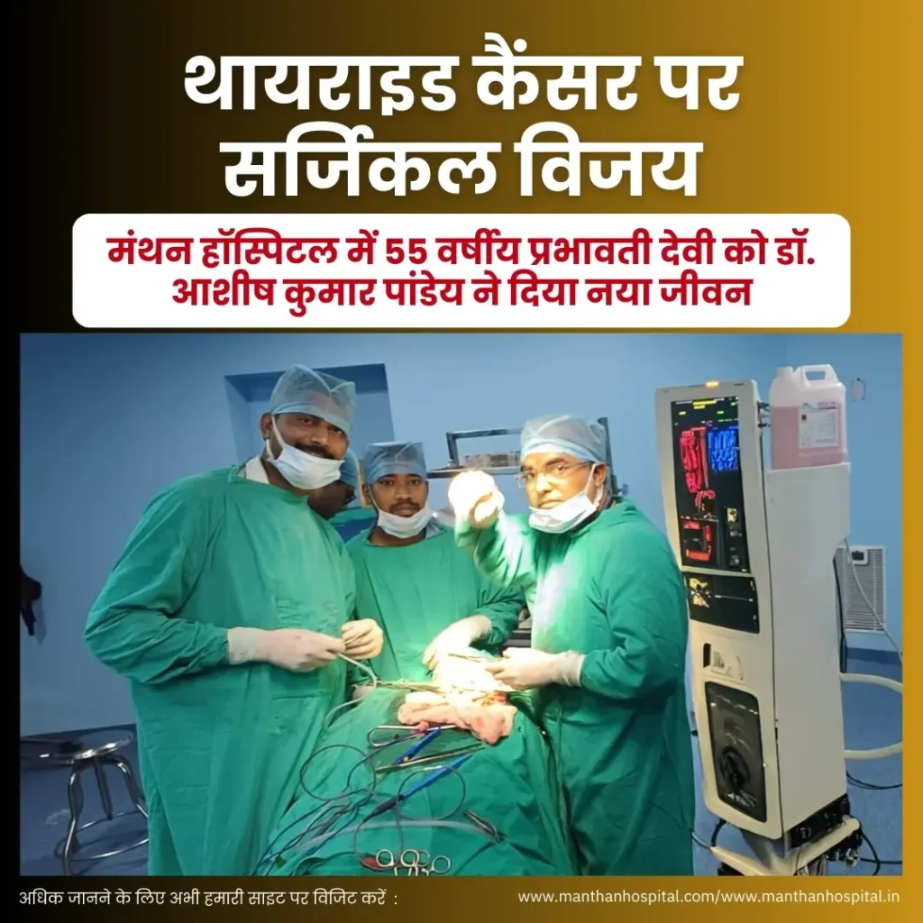 नमस्ते! मंथन हॉस्पिटल – मल्टी स्पेशियलिटी हॉस्पिटल की ओर से, मैं, डॉ. अभिषेक द्विवेदी, आज आपसे चिकित्सा विज्ञान की एक और महत्वपूर्ण उपलब्धि साझा करने के लिए उत्साहित हूँ। हमारे नैनी स्थित हॉस्पिटल में, कैंसर जैसी गंभीर बीमारी से जूझ रहे मरीजों को उम्मीद की नई किरण मिल रही है। हाल ही में, हमारी विशेषज्ञ सर्जिकल टीम ने एक जटिल थायराइड कैंसर के ऑपरेशन को सफलतापूर्वक अंजाम दिया, जिसने 55 वर्षीय मरीज, श्रीमती प्रभावती देवी (उम्र 55 वर्ष), को नया जीवन प्रदान किया। यह सफल ऑपरेशन मंथन हॉस्पिटल की अत्याधुनिक क्षमताओं और हमारे चिकित्सकों के अटूट समर्पण का एक और प्रमाण है।