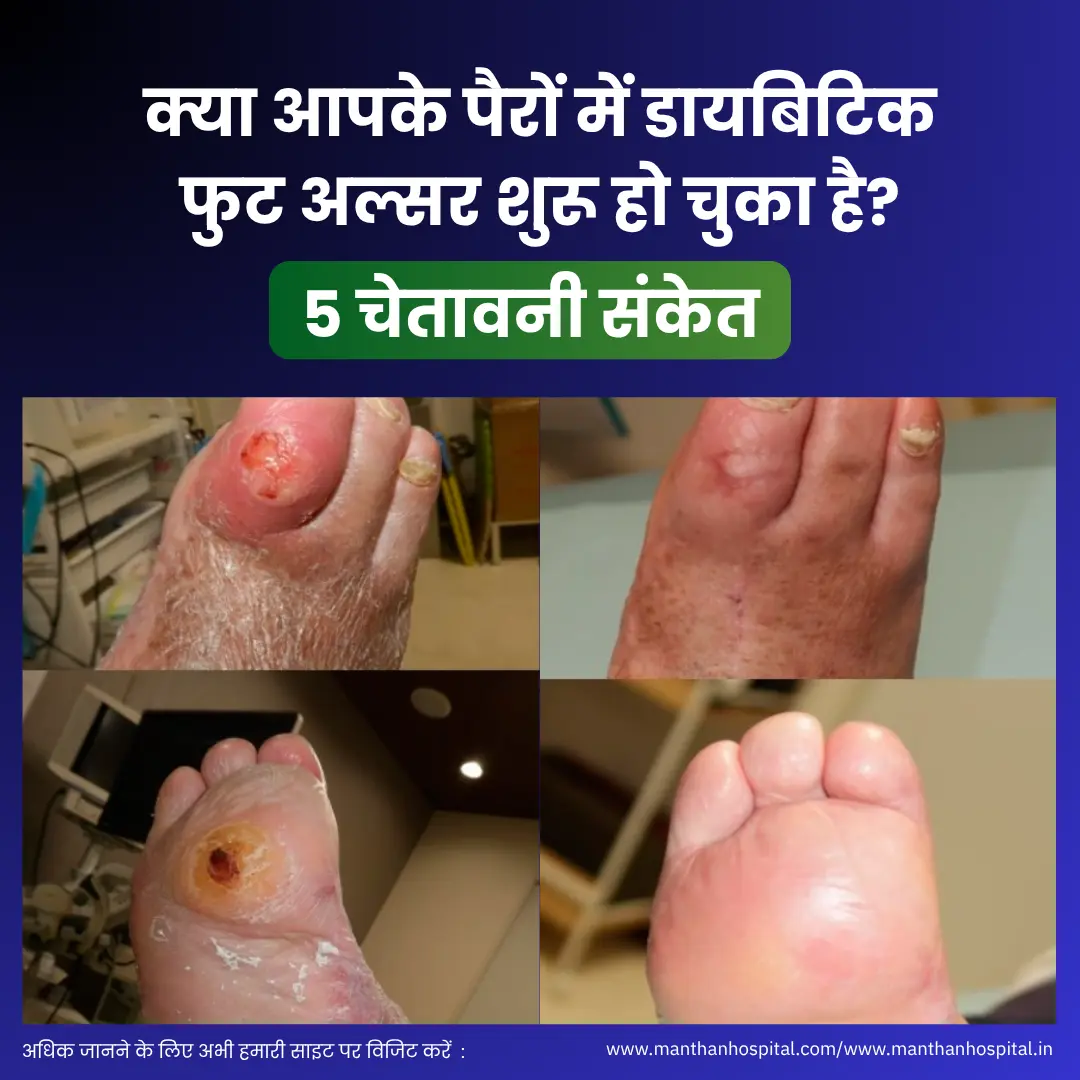 मंथन हॉस्पिटल का संदेश: आपके पैर आपके शरीर का आधार हैं, और मधुमेह होने पर उनकी विशेष देखभाल करना आपकी जिम्मेदारी है। इन 5 चेतावनी संकेतों को गंभीरता से लें। मंथन हॉस्पिटल प्रयागराज में, हम डायबिटिक फुट अल्सर की रोकथाम, शीघ्र निदान और उन्नत उपचार के लिए पूरी तरह से समर्पित हैं। ‘स्वस्थ नैनी के संकल्प’ के साथ, हम आपको स्वस्थ और सक्रिय जीवन जीने में मदद करने के लिए यहां हैं। अपने पैरों की उपेक्षा न करें – वे आपके स्वास्थ्य की कहानी कहते हैं।